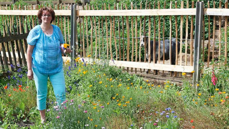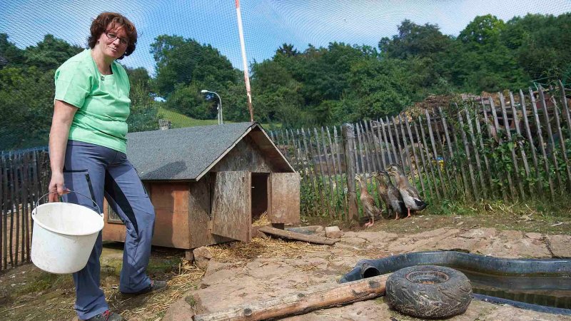 Gaby ist auf dem Hof für die Kleintiere zuständig. Sie füttert die Enten, Hühner, Ziegen und Kaninchen und bekommt dabei Unterstützung von Tochter Marie. Bei den Breuers packen eben alle mit an.