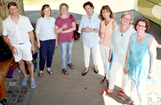 Nach der Besichtigung des Streichelzoos ruft Stephan Breuer die Gäste mit den Worten: „Die Damen bitte hier aufsitzen.“ Augenzwinkernd erklärt er: „Ich bin ja hier nicht nur schmückendes Beiwerk, sondern habe ja auch ein paar Aufgaben.“ Eine Kutschfahrt der besonderen Art erwartet die Landfrauen. Gezogen wird die Kutsche nämlich von geräuschvollen 20 PS in Form eines Lanz Bulldog, Baujahr 1954. Knatternd und qualmend geht es den Berg hinauf in die nähere Umgebung des Hofes, im Gepäck eine Flasche selbstgemachter Holunderblüten-Schnaps.